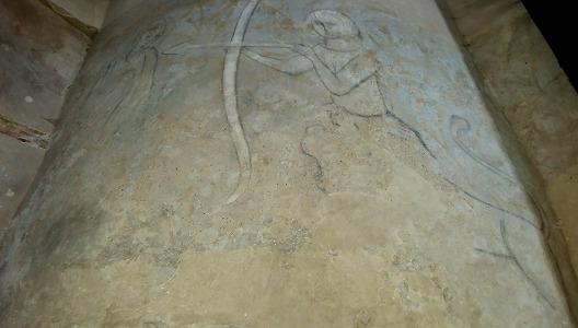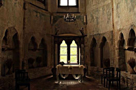 En 1260-1280, un château fut construit au sommet de la colline, probablement sur les ordres d’Ottokar II de Bohême. A cette occasion, la faille fut recouverte d’épaisses plaques de pierre et une chapelle fut bâtie juste au-dessus, afin de sceller la porte vers l’enfer. La chapelle était consacrée à l’archange Michel, chef des armées de Dieu dans la lutte contre les hordes diaboliques. Des fresques délavées, qui remontent au début du XIVe siècle, ornent toujours les murs de l’édifice. Elles montrent des scènes de la Crucifixion, de la vie de Saint-Christophe, et l’archange Michel terrassant le dragon, symbole du Mal, ou soupesant les âmes au jour du Jugement Dernier, armé d’une épée et d’une balance. Sur l’une des parois, une silhouette inhabituelle se distingue des autres. Une créature avec le haut du corps d’une femme et le bas du corps d’un cheval tient un arc dans sa main droite et de sa gauche, elle tire une flèche sur une silhouette humaine. Non seulement il est très rare de trouver la représentation d’un centaure, une créature de la mythologie païenne, sur les murs d’une église, mais cette représentation d’un archer gaucher est la seule connue. Au Moyen Âge, le gaucher était associé à Satan et les historiens pensent que cette image est liée aux histoires de créatures mi-humaines mi-animales qui sortaient prétendument de la porte de l’enfer.