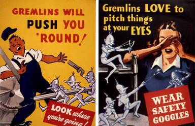 Du début de la Première Guerre mondiale à la fin de la seconde, des aviateurs de la Royal Air Force rapportèrent que des gremlins détraquaient volontairement leurs appareils, causant une multitude d’incidents. Leurs témoignages étaient si nombreux que le ministère de l’Armée de l’Air britannique finit par s’en inquiéter et une enquête fut décidée. Alors un manuel fut publié, qui expliquait aux pilotes la meilleure manière de gérer les gremlins.